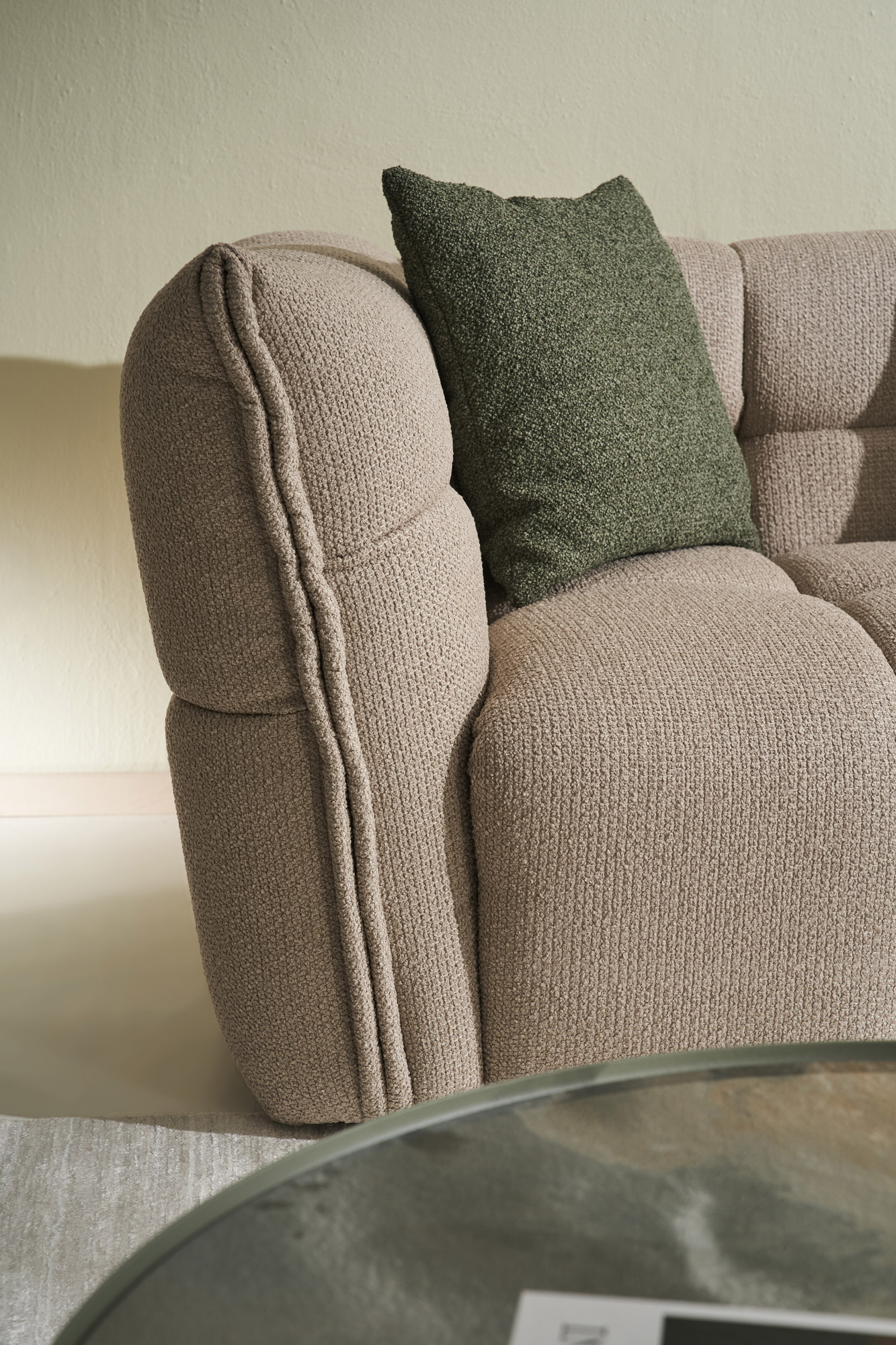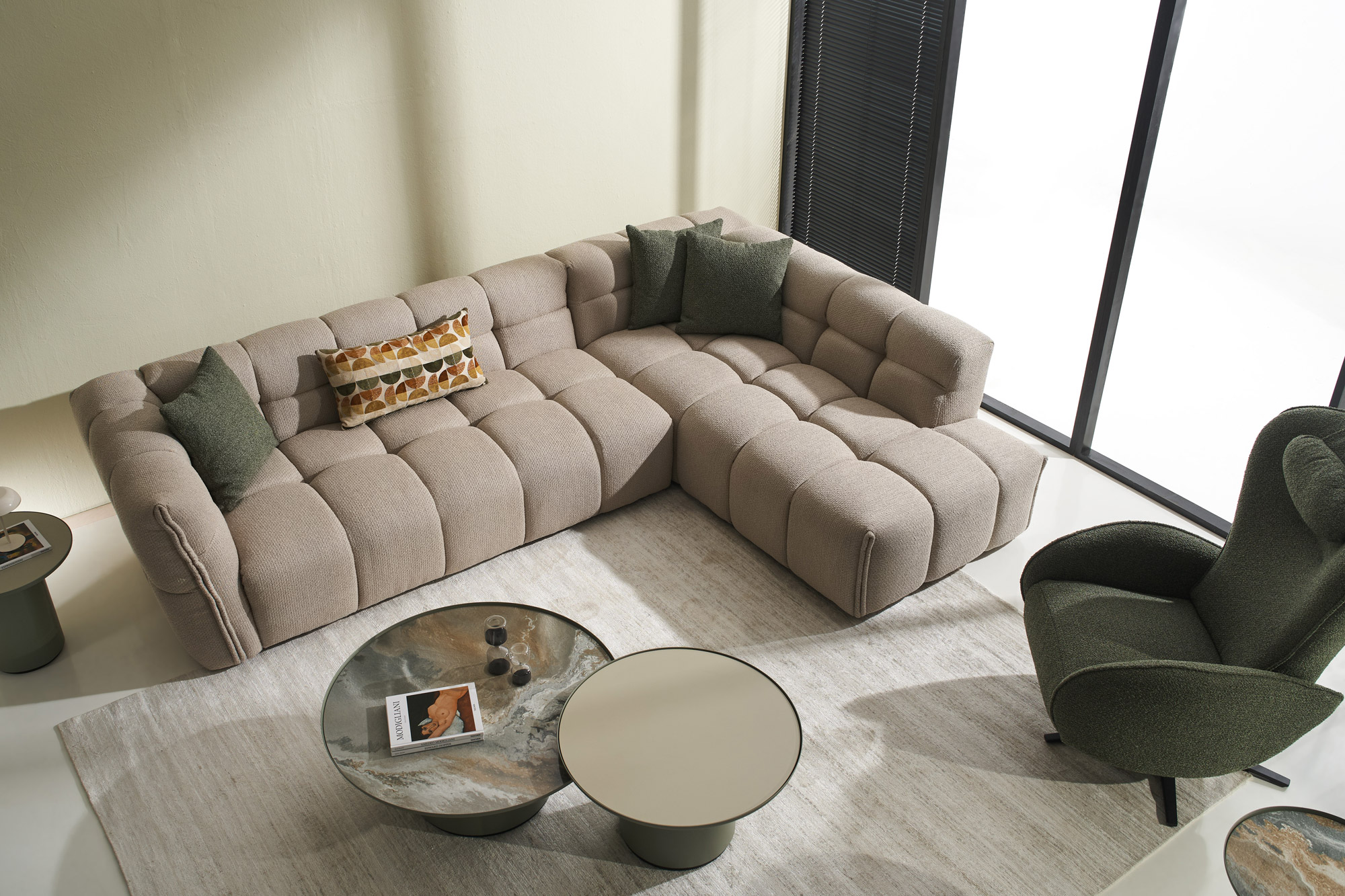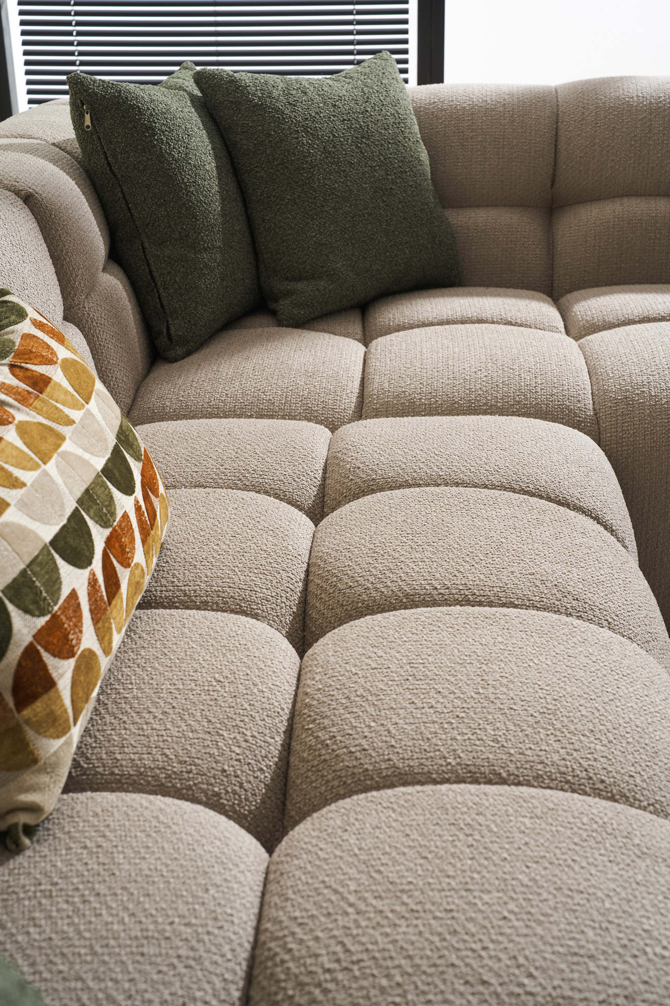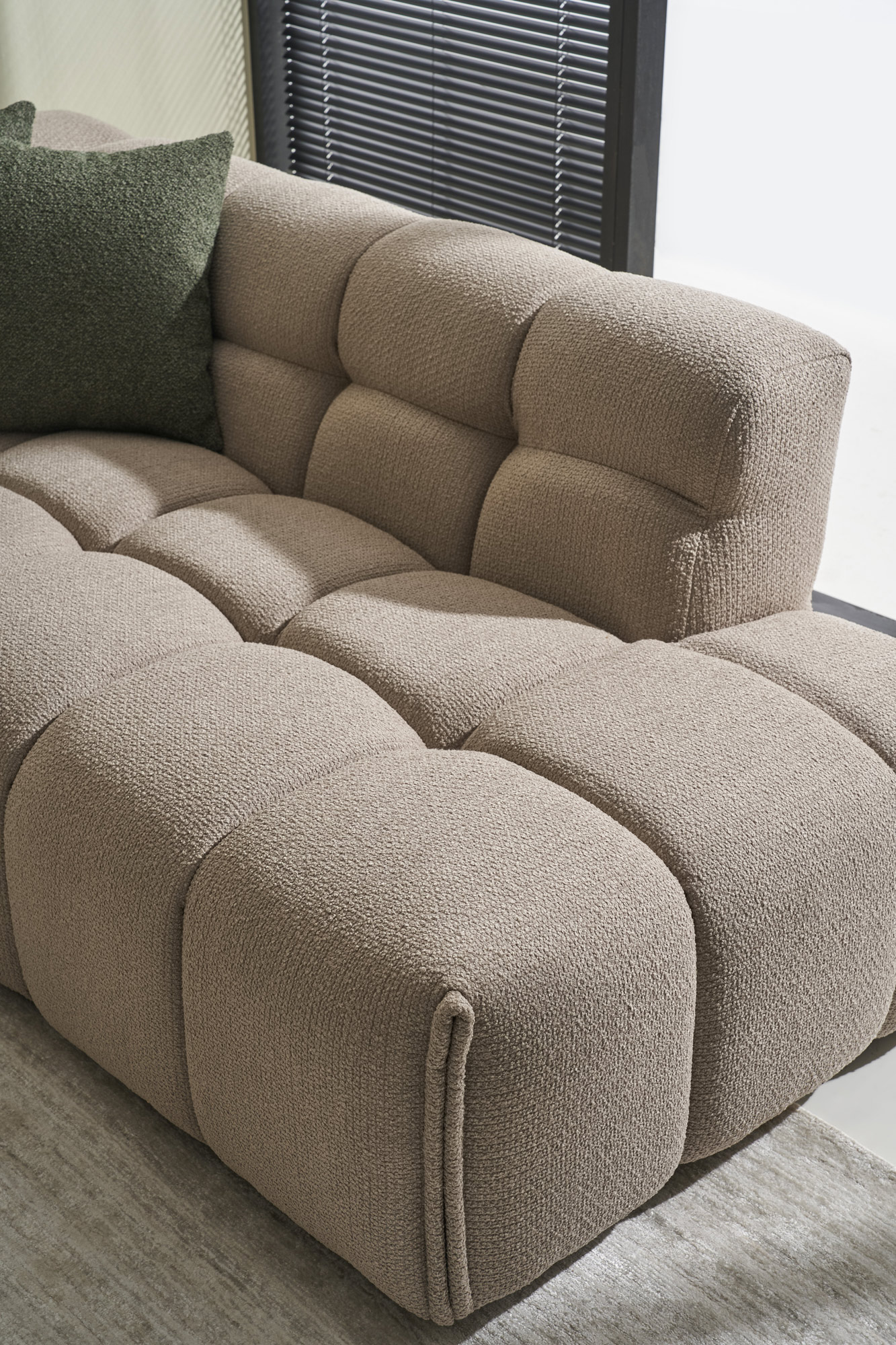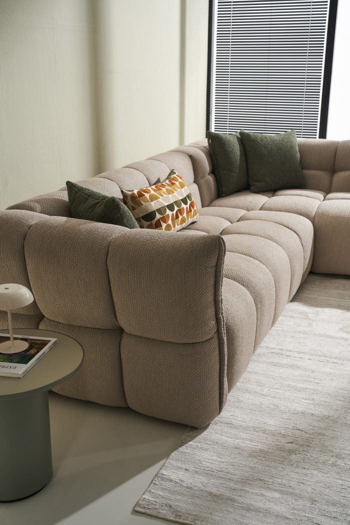 The BUBBLE corner sofa strikes the perfect balance between luxury, comfort, and modern aesthetics. Its signature soft quilted design extends seamlessly across the entire surface – from the backrest and armrests to the seat – creating a sense of plush elegance. With deep and wide seats that adapt to the body, BUBBLE offers ultimate ergonomics, while its structure ensures durability and stability for everyday use. Its full, well-defined curves blend a contemporary, maximalist style with the feeling of a warm embrace, making it ideal for moments of relaxation as well as hosting friends and family. Its subtle yet impressive lines and the sophisticated fabric texture bring a timeless elegance that can fit seamlessly into any space, whether it’s a modern loft, a cozy living room, or a minimalist setting. The BUBBLE is more than just a sofa – it’s a luxurious comfort experience that redefines style and quality.